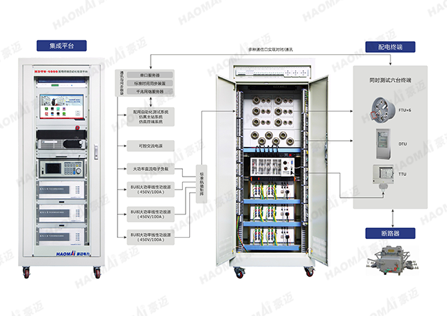 配電終端自動化檢測平臺可對配電終端進行功能測試、性能檢測、通信規(guī)約檢測,也可對一次設備施加高電壓大電流,實現(xiàn)對成套柱上開關及環(huán)網(wǎng)箱的成套設備性能和功能檢測。主要功能測試包括遙測、遙信、遙控、SOE分辨率、防抖、傳動、帶載能力、100A大電流檢測、穩(wěn)態(tài)錄波/暫態(tài)回放功能檢測、FA自動功能檢測等。主要性能檢測包括基本誤差檢測、影響量檢測、電源檢測、SNTP規(guī)約對時檢測等;通信規(guī)約檢測為基于安全防護的IEC101、IEC104通信規(guī)約檢測。