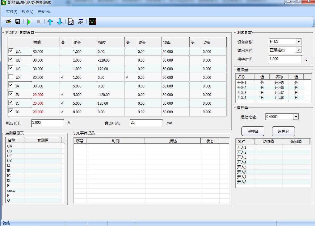 配電之星-P2200 可根據(jù)測試參數(shù)輸出方式,在界面選擇正常的通道電壓電流輸出、合成輸出、直流輸出、遙測值顯示,通過獲取配電終端的遙信及SOE數(shù)據(jù),實(shí)現(xiàn)對配電終端遙信可靠性、遙信防抖、SOE分辨率等功能檢測。