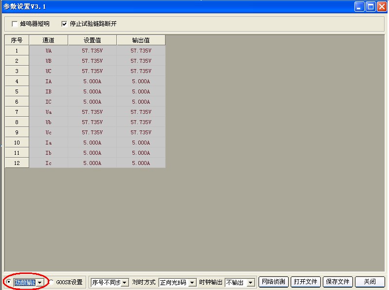 2) 點擊標(biāo)題欄中“61850”按鍵,進入?yún)?shù)設(shè)置界面,選擇左下角“功放輸出”,表示繼保儀輸出為模擬量電流電壓信號,然后直接點擊右下角關(guān)閉即可。