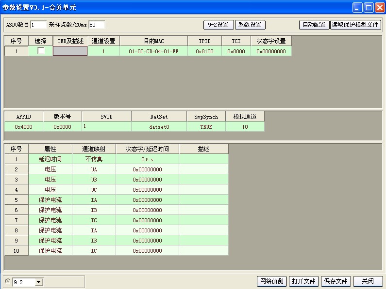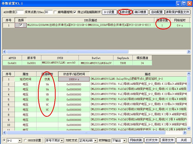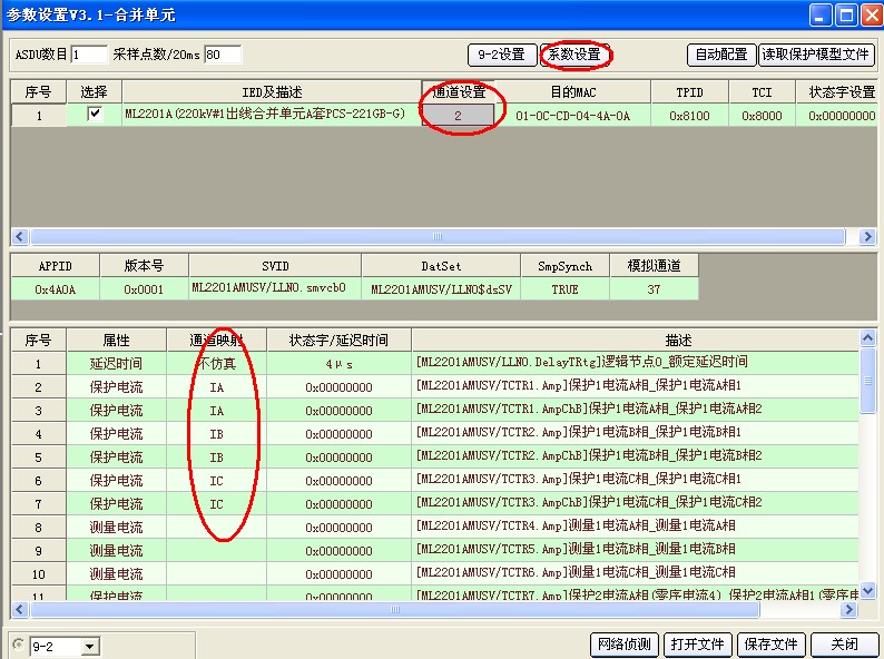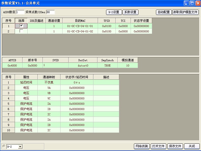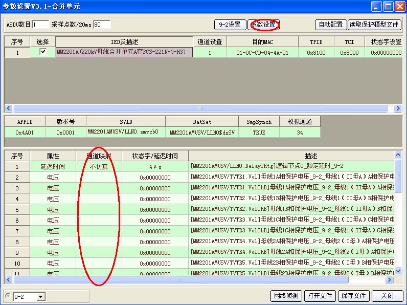 2)點擊上圖標(biāo)題欄中“61850”按鍵,進入?yún)?shù)設(shè)置界面,選擇左下角“9-2”。