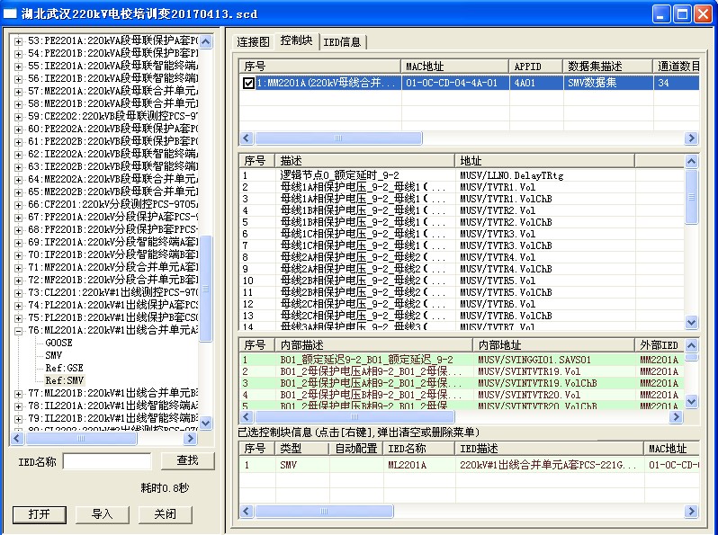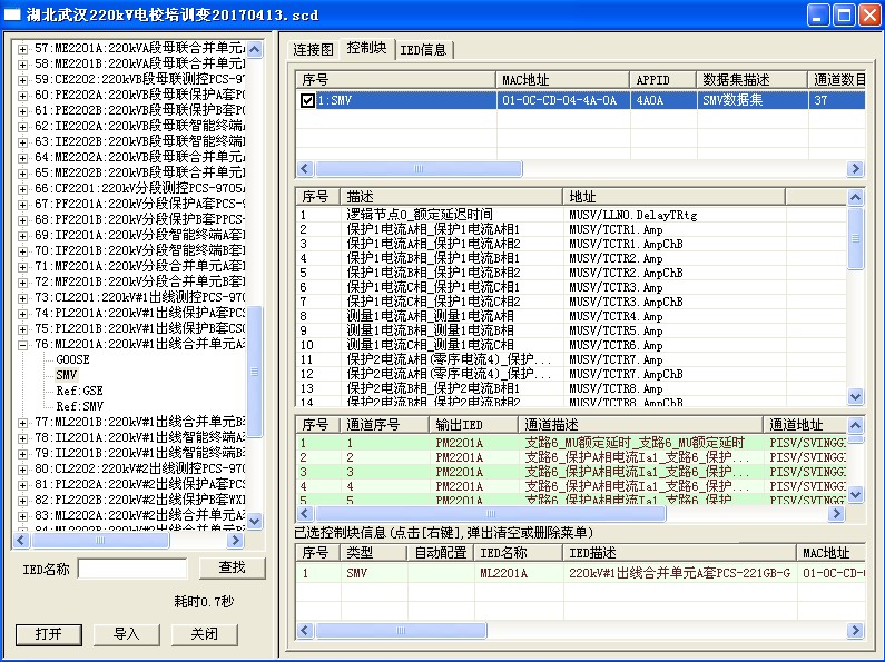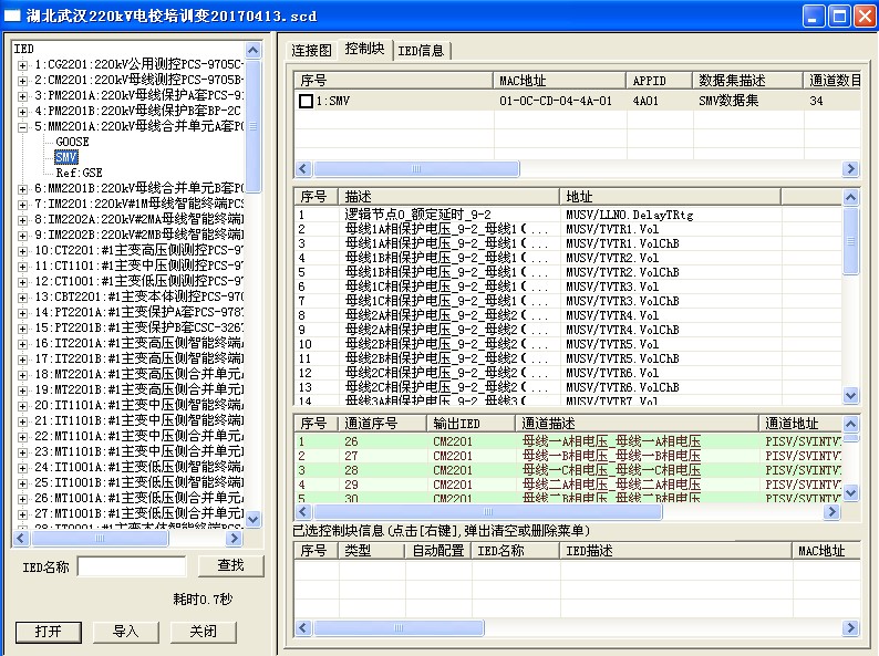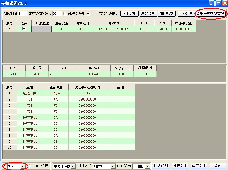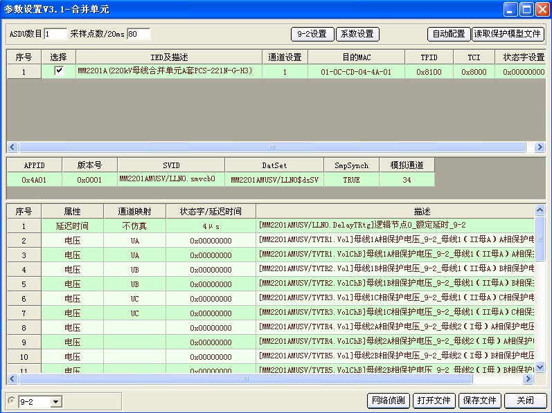 此界面需要配置母線PT合并單元輸出的數(shù)字信號配置給繼保儀,點擊上圖右上角“讀取保護模型文件”導(dǎo)入此合并單元輸出SV控制塊。