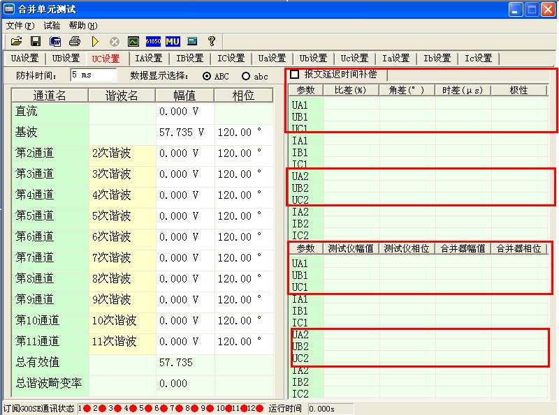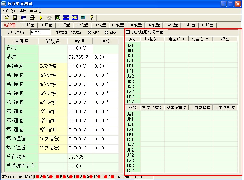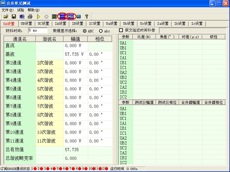 6)點擊右下角“關(guān)閉”即完成所有配置,接一組電壓信號電纜和一根數(shù)字信號光纖,設(shè)置對應(yīng)的UA、UB、UC基波電壓值(默認57.735V)即可開始試驗,其他諧波通道可以不設(shè)置。