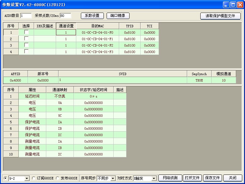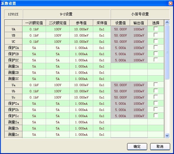 設(shè)置系統(tǒng)的一次額定值、二次額定值、參考值、采樣值和小信號(hào)信息, 輸出通道有UA、UB、UC、保護(hù)IA、保護(hù)IB、保護(hù)IC、測(cè)量IA、測(cè)量IB、測(cè)量IC、Ua、Ub、Uc、保護(hù)Ia、保護(hù)Ib、保護(hù)Ic、測(cè)量Ia、測(cè)量Ib、測(cè)量Ic和UU、UV、UW、保護(hù)IU、保護(hù)IV、保護(hù)IW、測(cè)量IU、測(cè)量IV、測(cè)量IW、Uu 、Uv、Uw、保護(hù)Iu、保護(hù)Iv、保護(hù)Iw、測(cè)量Iu、測(cè)量Iv、測(cè)量Iw共36路。