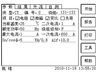 使用CTP-120P 互感器測試儀按照上圖接線方式進(jìn)行勵(lì)磁試驗(yàn),參數(shù)設(shè)置頁面中的負(fù)荷請?zhí)钊雽?shí)際負(fù)荷或者額定負(fù)荷。