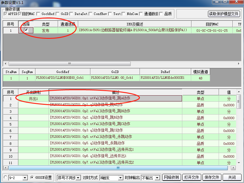 配置時需注意以下三點: ①繼保之星-6000C 模擬保護發(fā)GOOSE至智能終端,此類型應為發(fā)布; ②通道選擇為光纖1口; ③跳閘信號為通道1映射為開出1。