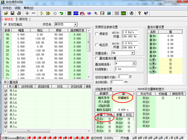 2)完成以上設置后即可在工具欄中點擊 “?”或按下鍵盤“run”鍵進行試驗,然后按“??”或“Tab”鍵觸發(fā)第一個狀態(tài),觀察智能終端裝置跳閘燈點亮,繼保之星-6000C 開入A會在狀態(tài)二的動作時間上記錄智能終端的跳閘時間,且動作時間應滿足≤7ms的要求。