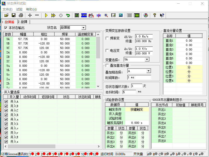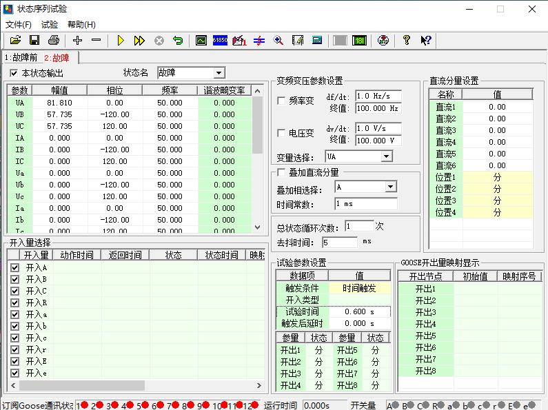 選擇狀態(tài)序列模塊,設(shè)置狀態(tài)1正常態(tài),Ua、Ub、Uc三相額定電壓幅值,三相正序角度,頻率50Hz,觸發(fā)條件按鍵觸發(fā)。