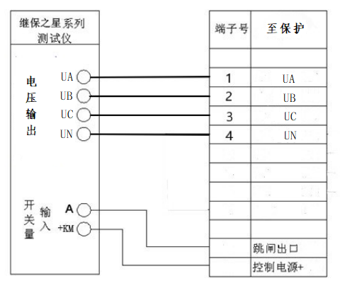 繼保之星-S60 手持式繼電保護(hù)測(cè)試系統(tǒng) 輸出電壓UA、UB、UC、UN接入變壓器保護(hù)裝置機(jī)端電壓端子排,發(fā)電機(jī)保護(hù)裝置端子排的跳閘出口接入繼保之星-S60 開入量A和公共端。