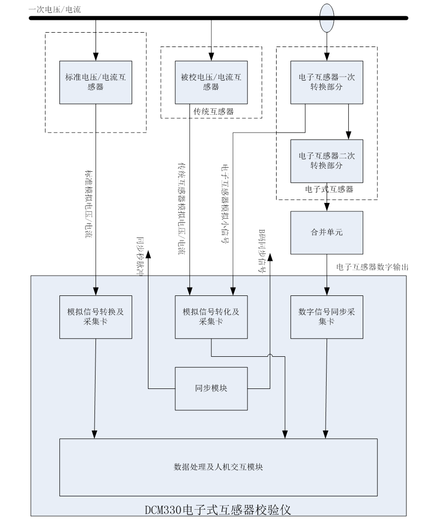 DCM-330 電子式互感器校驗(yàn)儀做精度校驗(yàn)時(shí),校驗(yàn)系統(tǒng)同時(shí)將標(biāo)準(zhǔn)互感器和被?;ジ衅鞯膬陕沸盘?hào)輸入。