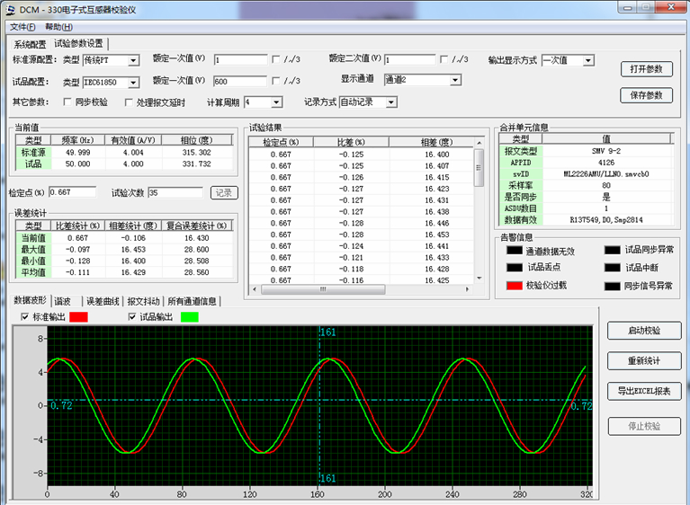 DCM-330 電子式互感器校驗(yàn)儀信號(hào)處理程序采用高精度算法和頻率跟蹤處理,對(duì)各種規(guī)范的解碼具有通用性,能夠根據(jù)被校通道數(shù)據(jù),進(jìn)行數(shù)據(jù)分析,通過(guò)綜合處理得到被校設(shè)備的比差、角差、頻率等指標(biāo),同時(shí)完成波形繪制,并將指標(biāo)保存為表格。