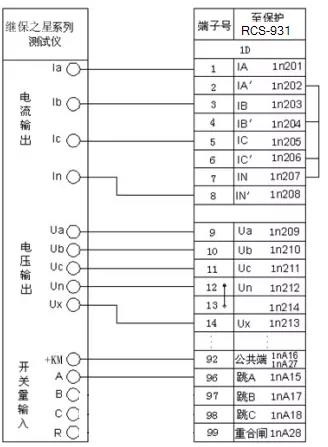 繼保之星-S60 電壓輸出端“Ua”、“Ub”、“Uc”、“Un”分別與保護裝置的交流電壓“Ua”、“Ub”、“Uc”、“Un”端子相連。 繼保之星-S60 電流輸出端“Ia”、“Ib”、“Ic”分別與保護裝置的交流電流“IA”、“IB”、“IC”(極性端)端子相連; 再將保護裝置的交流電流“IA'”、“IB'”、“IC'”(非極性端)端子短接后接到“IN”(零序電流極性端)端子,最后從“IN'”(零序電流非極性端)端子接回繼保之星-S60 電流輸出端“In”。
