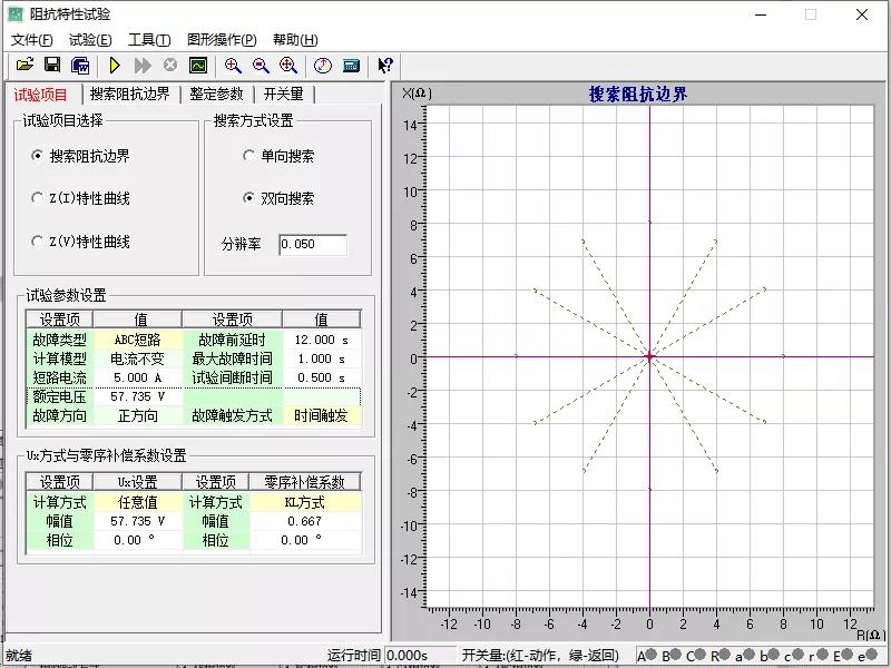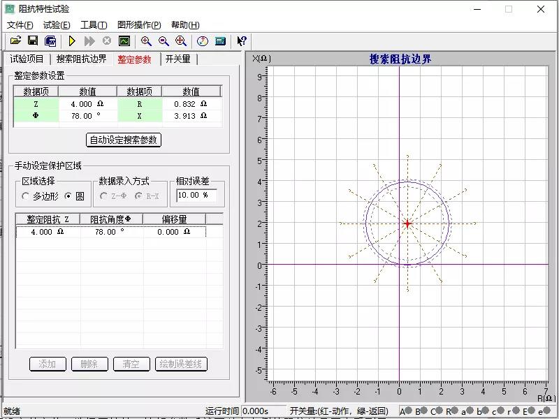 搜索中心為定值的一半,為2Ω,正序阻抗角78°,搜索半徑要大于定值的一半,可設(shè)置為3Ω。 角度步長決定了搜索點的多少,步長越小搜索的點越多,精度越高,耗時越久,步長越大搜索的點越少,精度相對低,耗時較短。 建議設(shè)置步長30°,搜索線數(shù)12條。