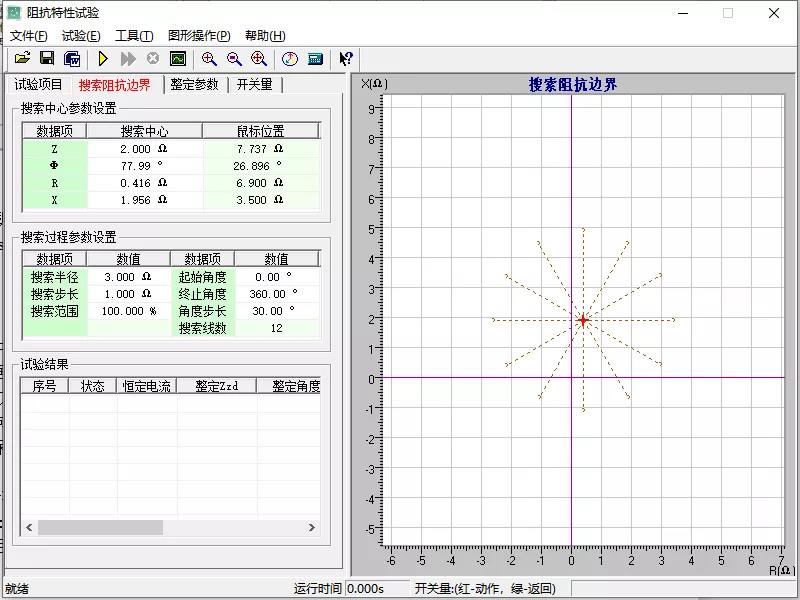 在“阻抗特性試驗”菜單里選擇搜索阻抗邊界,搜索方式選擇雙向搜索,分辨率0.05,具體參數(shù)設(shè)置如下。