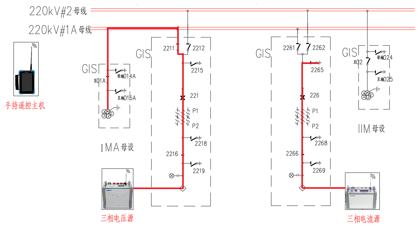 2)由于各一次設(shè)備不能在GIS內(nèi)部接線,考慮電流電壓從兩間隔的進出線引線側(cè)接入,電流選取226開關(guān)間隔,將電流從226引線處接入,經(jīng)隔刀2266流過CT再經(jīng)開關(guān)226流過,最終由地刀2265流入大地形成電流回路。