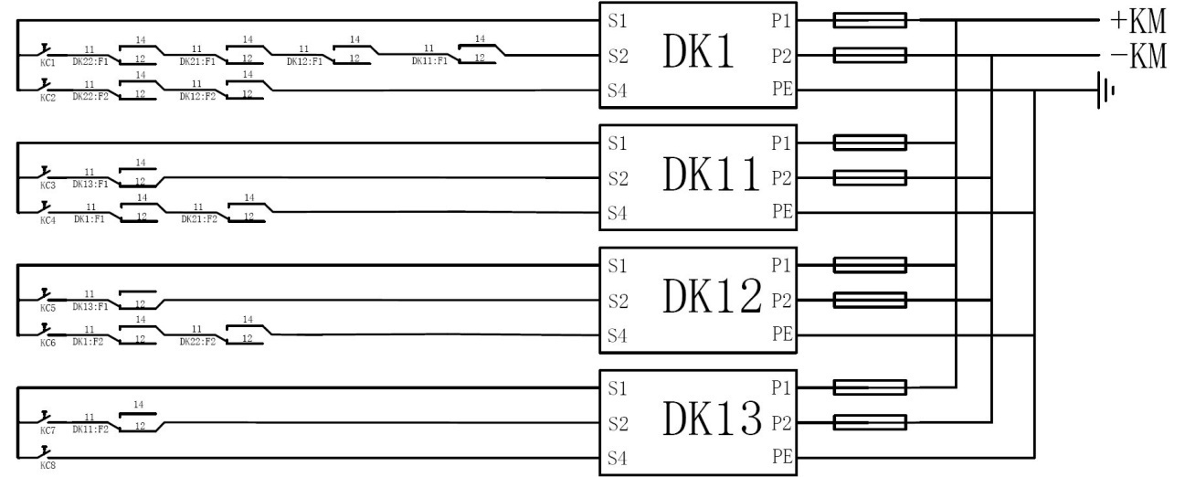 DK11、DK12、DK21、DK22四個(gè)常開輔助觸點(diǎn)串聯(lián) |
