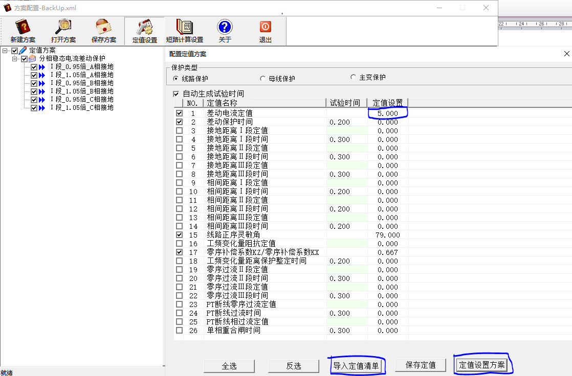 設置線路方案定值項: