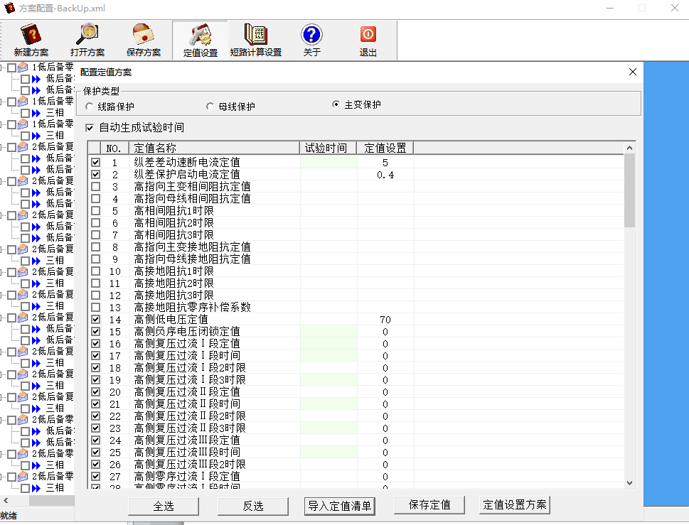 主變方案定值項設置: