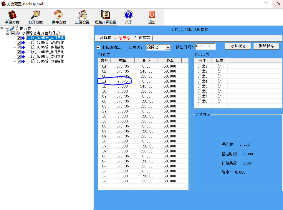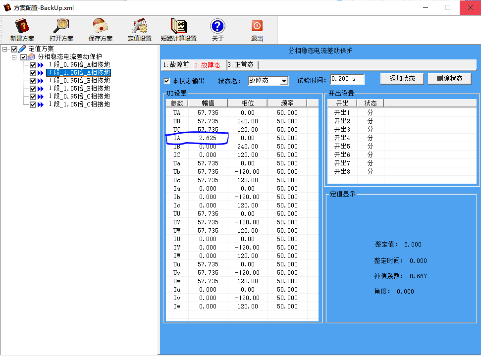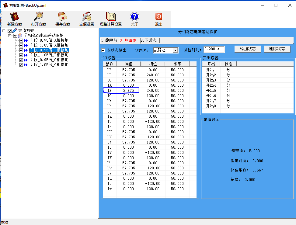 自動生成故障前、故障態(tài)和正常態(tài)三種狀態(tài),針對0.95倍、1.05倍以及ABC三相不同的測試項目,生成不同的故障態(tài)結果,結果可進行手動修改。