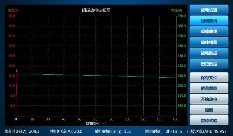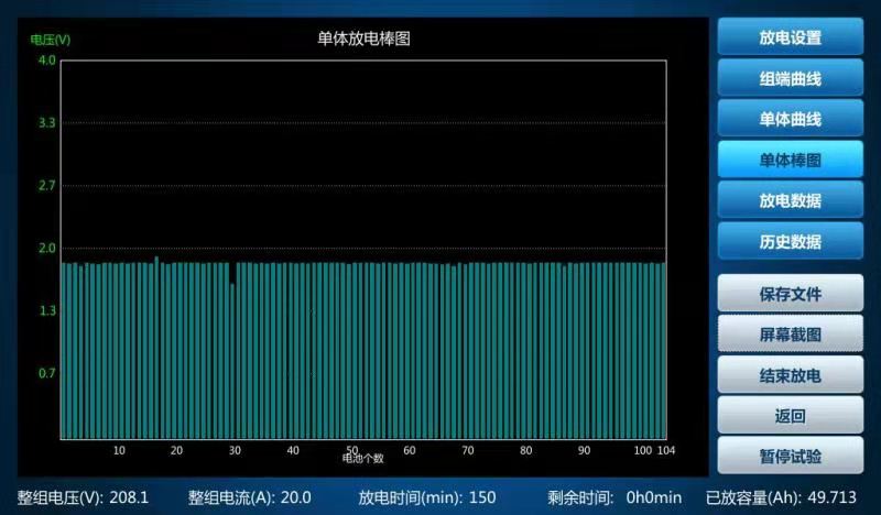 放電結(jié)束后自動(dòng)停止試驗(yàn)即為放電過程正常。 如出現(xiàn)單體電池低于下限,組端電壓低于下限,試驗(yàn)將自行終止,可根據(jù)現(xiàn)場情況具體處理。 單體電池低于下限,即為電池內(nèi)部損壞,需更換同規(guī)格型號(hào)的電池。 組端電壓過低,可檢測充電機(jī)電壓充電時(shí)的電壓,找出落后的蓄電池進(jìn)行替換。