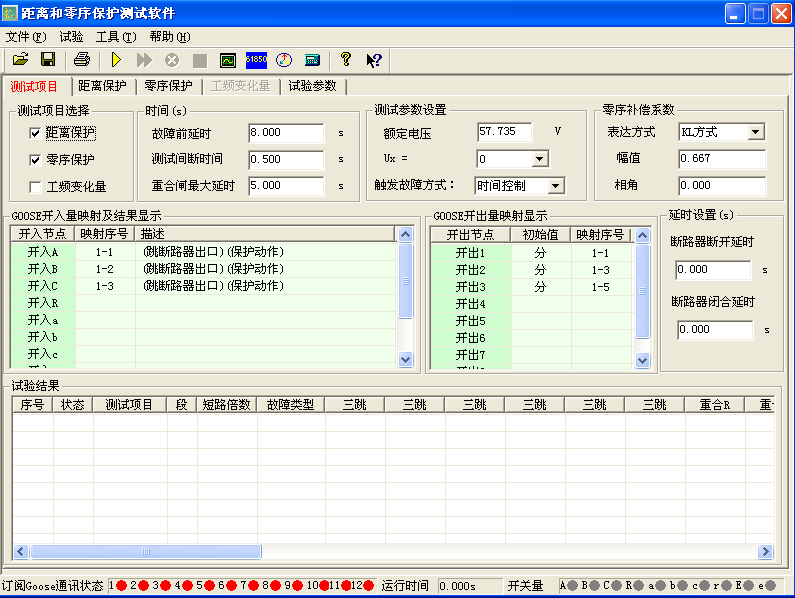 4)設(shè)置的各段“試驗(yàn)時(shí)間”必須大于該段的整定動(dòng)作時(shí)間。 例如: 假設(shè)I段整定動(dòng)作時(shí)間為0s,II段為0.5s,III段為1.0s。 考慮到保護(hù)本身跳閘有一定的固定延時(shí),可以設(shè)I、II、III段的試驗(yàn)時(shí)間分別為0.2s、0.7s、1.2s。 測試的理想結(jié)果將是: 0.95倍時(shí),本段動(dòng)作; 1.05倍時(shí),本段不動(dòng),下一段時(shí)間不夠不動(dòng)作。 也可以將上述三段的時(shí)間均設(shè)置為大于第三段動(dòng)作時(shí)間。 測試的理想結(jié)果將是: 0.95倍時(shí),本段動(dòng)作; 1.05倍時(shí),本段不動(dòng),下一段動(dòng)作。