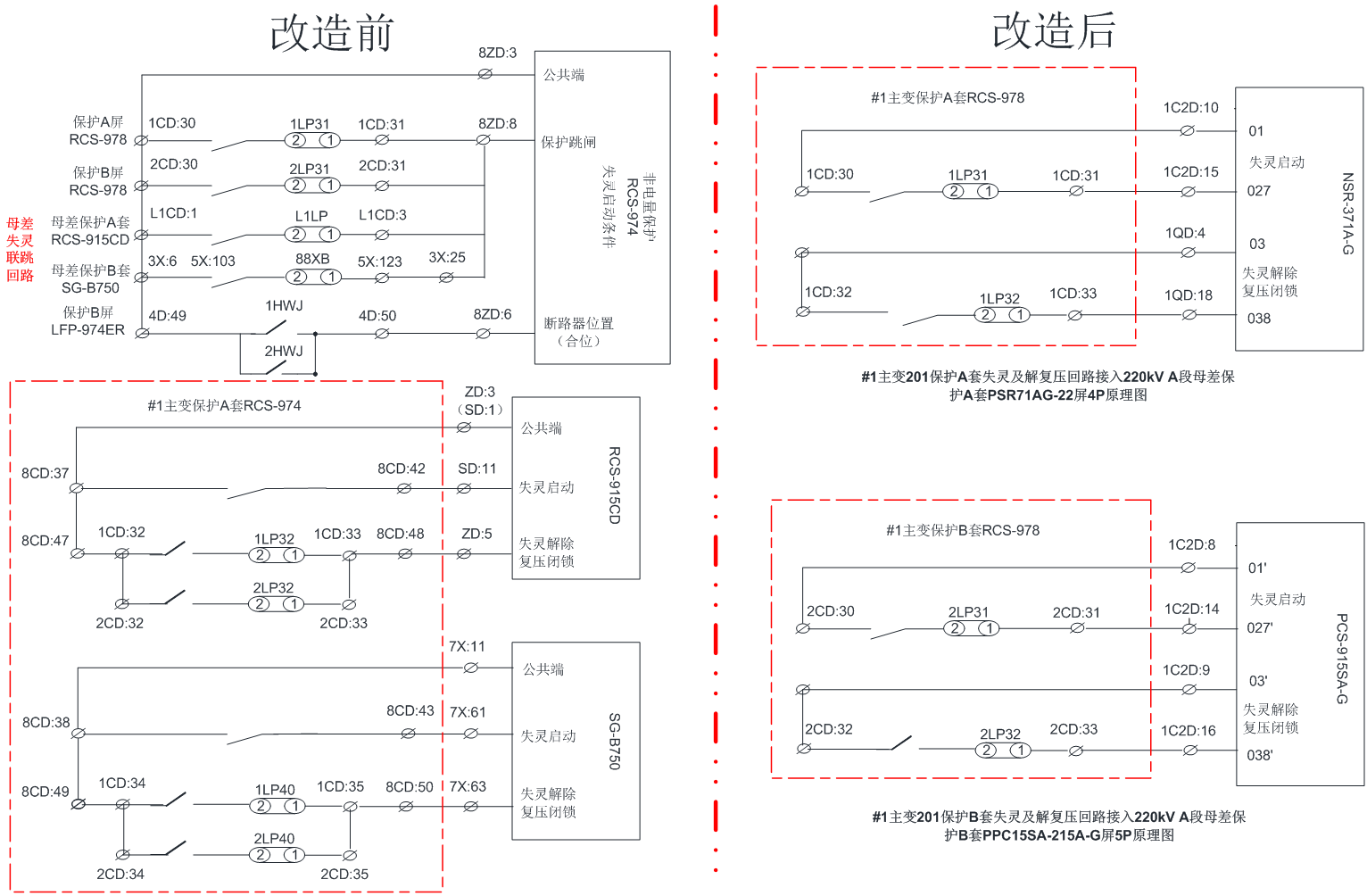 2)以#1主變間隔改造為例。 我司技術人員通過繼保之星-7000 拓撲圖功能發(fā)現(xiàn)主變保護A屏舊回路啟失靈和解除復壓閉鎖至母差A、B套。 而新回路要求主變保護A屏啟失靈和解除復壓閉鎖至母差A套。 所以先改造母差A套回路,母差B套運行的情況下,保留主變保護A屏啟失靈和解除復壓閉鎖至母差B套的回路,主變保護B屏啟失靈和解除復壓閉鎖至母差B套的回路。