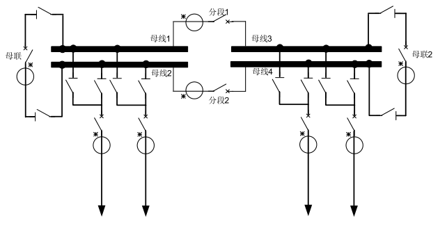 雙母雙分段主接線各段母線上除母聯(lián) CT 外,其他所有支路CT極性必須一致,分段1的CT極性與母線1上其他支路 CT 極性保持一致,分段2的 CT 極性與母線2上其他支路CT極性保持一致,雙母雙分段主接線需配置2套母線保護實現(xiàn)分段斷路器各側母線的保護,分段斷路器左側母線1、母線2采用一套母線保護,分段斷路器右側母線3、母線4采用一套母線保護。