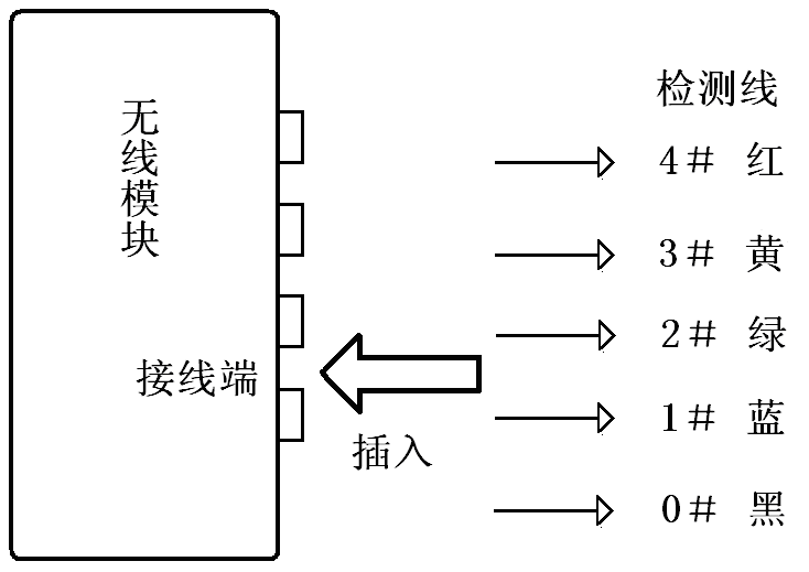 模塊側面有5個插口端,可插入5個檢測線夾,依次命名為0#端(黑)、1#端(藍)、2#端(綠)、3#端(黃)、4#端(紅)。