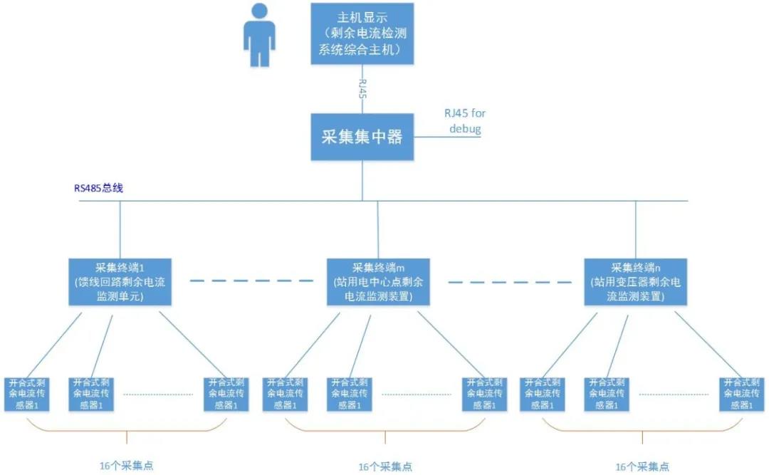 系統(tǒng)由剩余電流采集終端、剩余電流集中器、剩余電流監(jiān)測系統(tǒng)主機三部分組成。