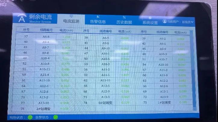 剩余電流監(jiān)測系統(tǒng)主機: 通過人機交互界面,實現(xiàn)智能化管理。 主機顯示各個站點實時剩余電流值,對安裝的線路進行實時監(jiān)測,診斷線路設(shè)備運行狀態(tài),免去人工現(xiàn)場巡檢。 若監(jiān)測到測量值超過設(shè)定報警值,通信狀態(tài)或設(shè)備工作狀態(tài)存在異常,屏幕上顯示警告信息,并記錄告警發(fā)生時間。 主機系統(tǒng)自動記錄3個月內(nèi)的監(jiān)測數(shù)據(jù),以數(shù)據(jù)表格或圖形方式展示,為剩余電流值變化狀態(tài)分析提供決策依據(jù)。 人機界面提供登錄管理、權(quán)限區(qū)分功能,設(shè)置不同權(quán)限人員對設(shè)備的查看、操作權(quán)限,防止設(shè)備數(shù)據(jù)被意外篡改。
