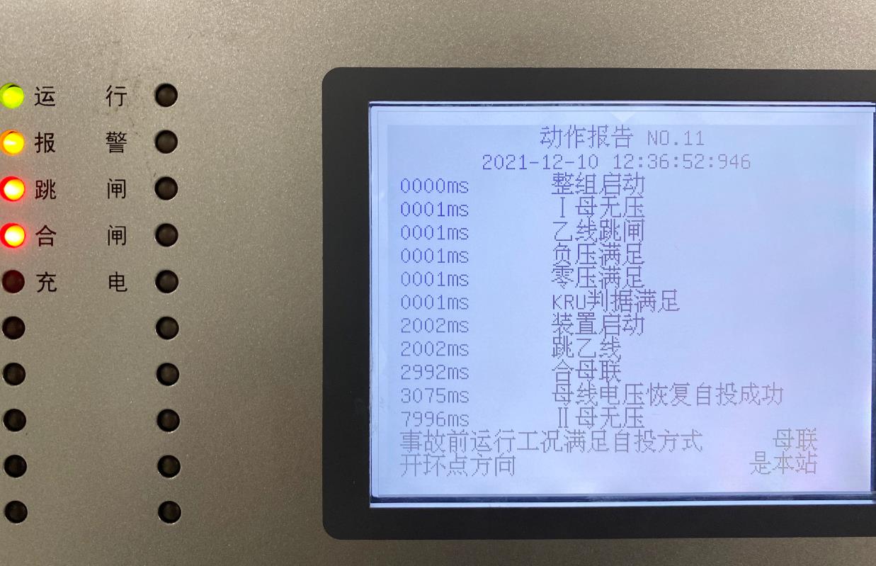 設(shè)置乙線無(wú)壓,兩條母線正常電壓,此時(shí)備自投裝置分段開(kāi)關(guān)合閘,但分段開(kāi)關(guān)DL3仍為分位,即開(kāi)出3分,乙線斷路器DL1為分位,開(kāi)出1分,丙線斷路器DL2合位,開(kāi)出2合,設(shè)置時(shí)間觸發(fā),大于整定值設(shè)置為2s。