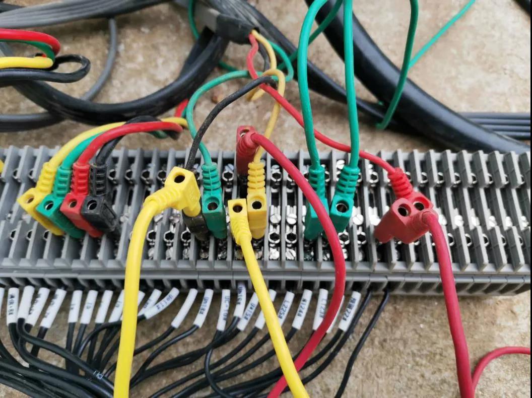 2)模擬量信息采集器與工裝接線端子排接線 : 將工裝接線端子排的電流六芯航插頭插入信息采集模塊的中間側(cè)航插口。 工裝接線端子排的遙測電壓、遙信、遙控26芯航插頭插入信息采集模塊的右側(cè)航插口。