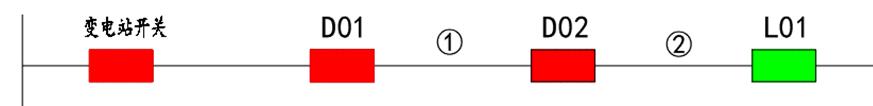 1)模擬故障點①故障 : D01檢測到故障后D01跳閘,D02失壓分閘,D01重合閘,合于故障后D01加速跳閘并正向閉鎖,D02檢測到殘壓反向閉鎖,故障隔離在D01和D02之間。 30秒后聯(lián)絡(luò)開關(guān)L01單側(cè)有壓合閘,完成自動轉(zhuǎn)供。