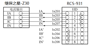 將繼保之星-Z30 電流輸出端“Ia”、“Ib”、“Ic”分別與保護(hù)裝置的交流電流“IA”、“IB”、“IC”(極性端)端子相連;