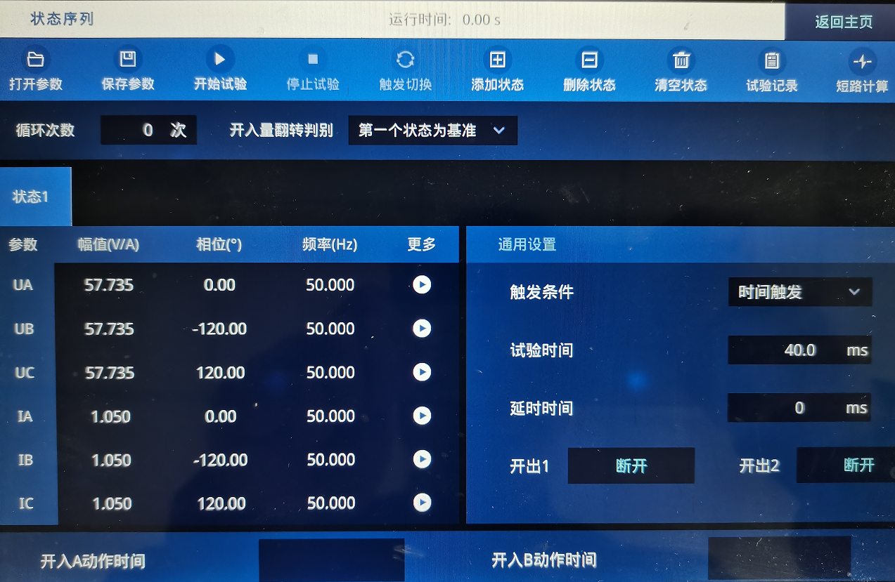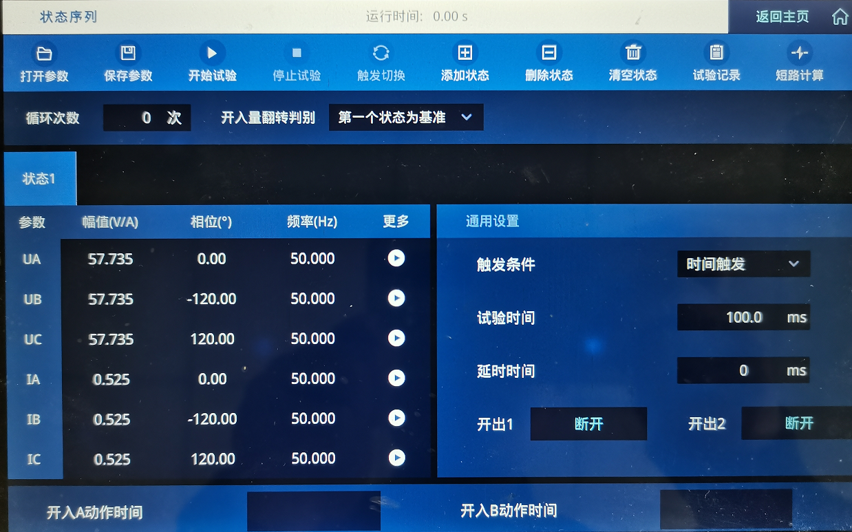 UA=UB=UC=57.734V,IA=IB=IC=0A,電壓電流均為正序,觸發(fā)方式: