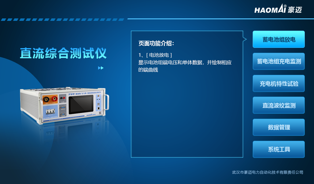 蓄電池組是變電站直流系統(tǒng)的核心,用以保證變電站在交流失電的情況下各種直流負(fù)荷及事故照明的供電。 按照規(guī)程定期對(duì)蓄電池組開展放電容量測(cè)試是準(zhǔn)確驗(yàn)證蓄電池組性能的有效方式。 武漢豪邁電力FDT-220/110 直流系統(tǒng)綜合測(cè)試儀集蓄電池組放電、充電機(jī)紋波系數(shù)、穩(wěn)壓穩(wěn)流精度特性測(cè)試于一體,可自動(dòng)連續(xù)調(diào)控放電電流,實(shí)現(xiàn)定電流恒流放電。