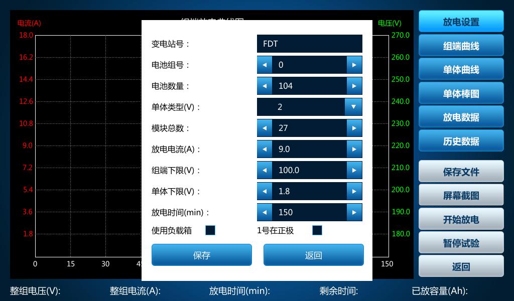 在設(shè)置放電試驗(yàn)和充電機(jī)特性試驗(yàn)時(shí)若保存失敗,請(qǐng)關(guān)閉之前暫停的試驗(yàn)后再設(shè)置。