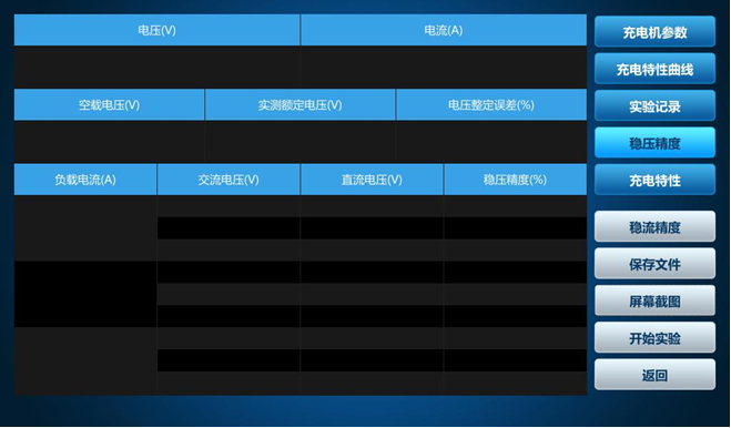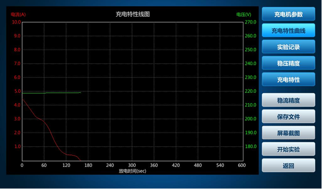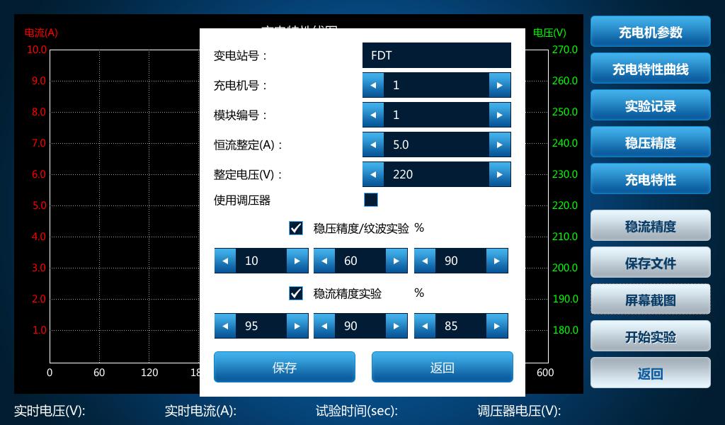 3)充電機(jī)特性試驗(yàn): 設(shè)置充電參數(shù)時(shí)若要使用調(diào)壓器則勾選,選擇對(duì)應(yīng)的穩(wěn)壓精度、充電特性、穩(wěn)流精度進(jìn)行試驗(yàn)。