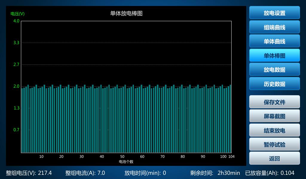 2)充電檢測(cè)試驗(yàn): 進(jìn)入充電檢測(cè)試驗(yàn)界面,設(shè)置試驗(yàn)參數(shù),點(diǎn)擊開始充電按鈕進(jìn)行試驗(yàn),并實(shí)時(shí)監(jiān)測(cè)組端電壓與單體電壓。 該試驗(yàn)不需要合上空開,正常顯示充電電壓,充電電流顯示為0。