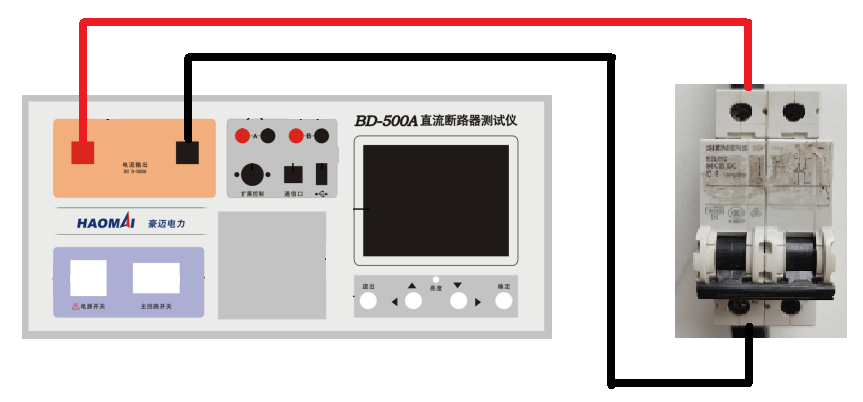 將BD-500A 直流斷路器安秒特性測(cè)試儀的輸出正極紅線接入空開輸入端,輸出負(fù)極黑線接入空開輸出端,試驗(yàn)前保持空開處于斷開狀態(tài)。