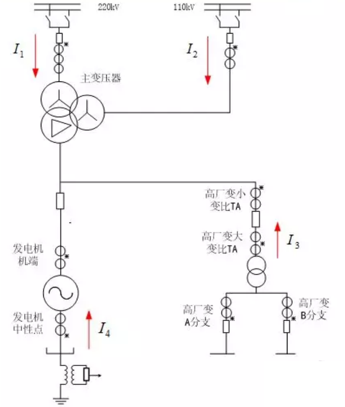 某 電 廠發(fā)變組系統(tǒng)見下圖,主變?yōu)槿ψ?,廠變低壓側(cè)為雙分支,發(fā)變組差動(dòng)包含四個(gè)支路電流,分別為主變220kV側(cè)I1,110kV側(cè)I2,高廠變高壓側(cè)I3,發(fā)電機(jī)中性點(diǎn)側(cè)I4。
