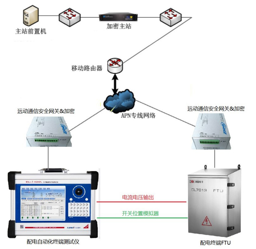 配電自動化主站與配電自動化測試儀通過無線網(wǎng)絡協(xié)議交互,配電自動化測試儀通過自動測試方案給配電終端施加不同的模擬量和狀態(tài)位置,配電自動化主站監(jiān)視到終端各種行為后,通過主站安全接入?yún)^(qū),由通信運營商無線 4G 專用網(wǎng)絡,傳輸給配電自動化測試儀進行處理和運算,并給出結論。