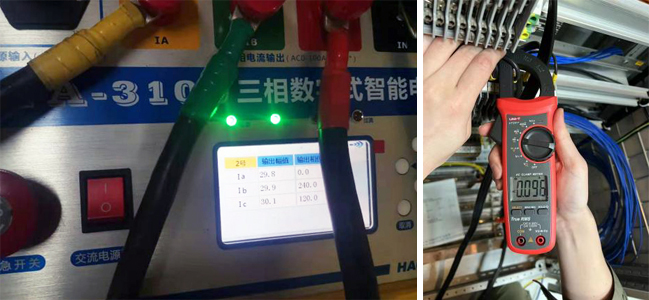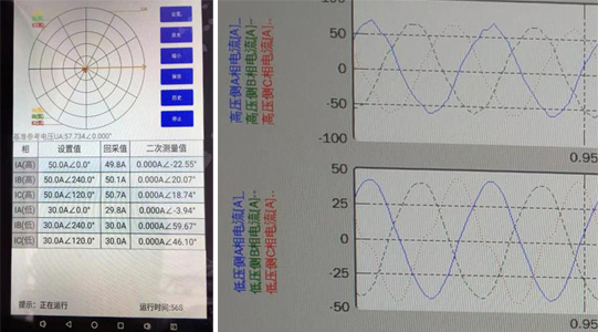 此時(shí)用鉗表在二次側(cè)測(cè)到高壓側(cè)的二次電流幅值,可以看出高壓側(cè)輸出與變比正常,再進(jìn)行低壓側(cè)手動(dòng)模式加量。