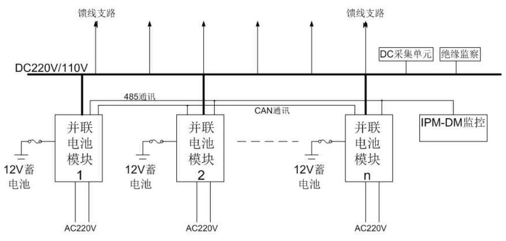 并聯(lián)型直流電源系統(tǒng)由若干個并聯(lián)電池模塊高壓輸出端并聯(lián)組成,每個模塊可配置12V蓄電池,高壓DC220V/110V。 系統(tǒng)配置直流饋線支路若干,絕緣監(jiān)察裝置、開關(guān)量監(jiān)測裝置、系統(tǒng)監(jiān)測觸摸屏裝置等。