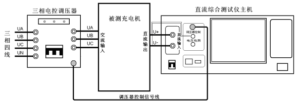 三相電控調(diào)壓器串入三相四線電源與被測(cè)充電機(jī)輸入之間,調(diào)壓器輸出接入被測(cè)充電機(jī)的輸入,調(diào)壓器控制信號(hào)線連接調(diào)壓器與主機(jī),實(shí)現(xiàn)主機(jī)對(duì)調(diào)壓器的自動(dòng)控制。
