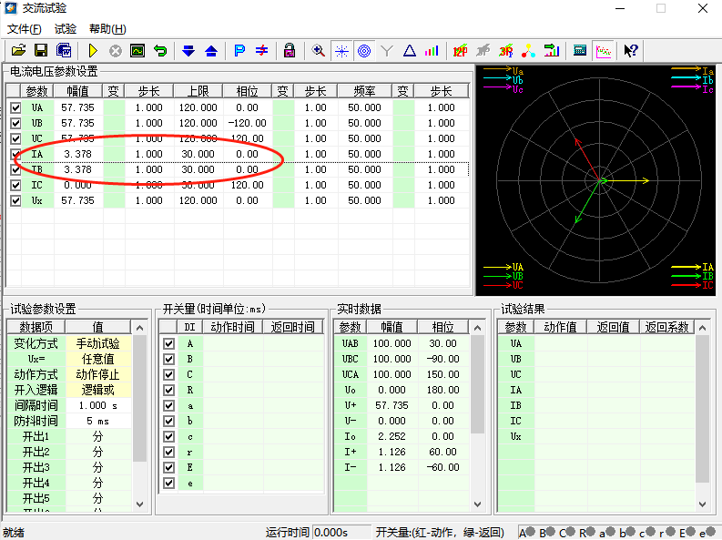 根據(jù)以上試驗(yàn)接線與分析,通過繼保之星-7000S 兩相電流即可做發(fā)變組差動平衡值,發(fā)電機(jī)機(jī)端A相施加電流IA=3.378A∠0°,中性點(diǎn)側(cè)A相流入電流IB=3.378A∠0°。