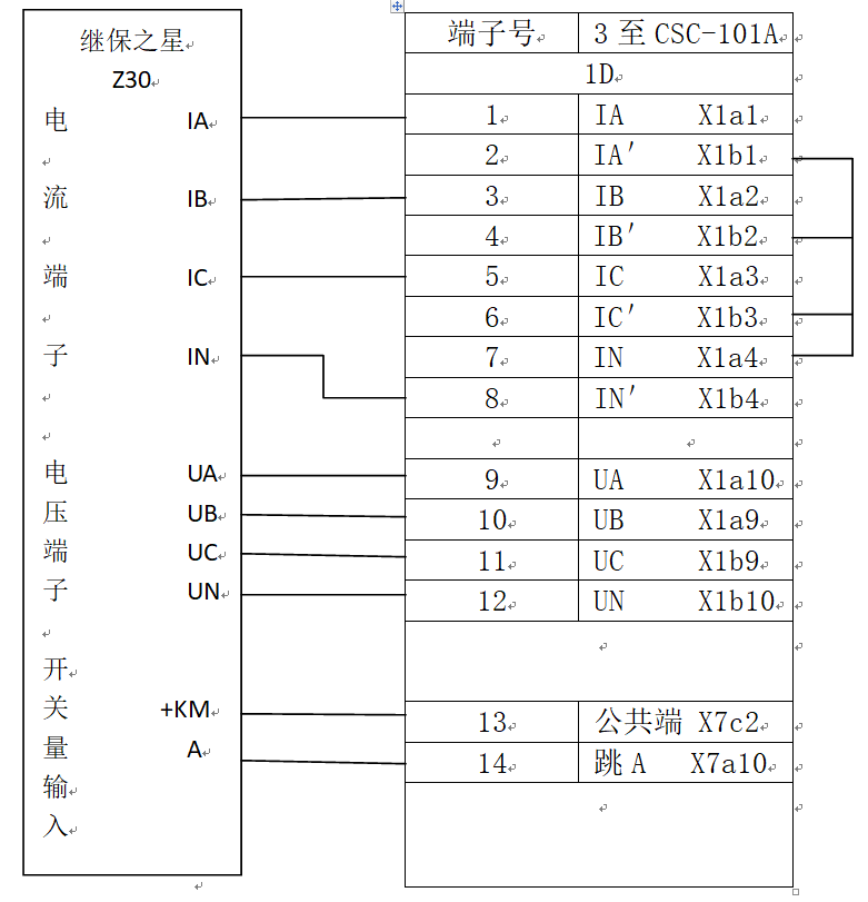 將繼保之星-Z70 的電壓輸出端“Ua”、“Ub”、“Uc”、“Un”分別與保護(hù)裝置的交流電壓“UA”、“UB”、“UC”、“UN”端子相連。 將繼保之星-Z70 的電流輸出端“Ia”、“Ib”、“Ic”分別與保護(hù)裝置的交流電流“IA”、“IB”、“IC”(極性端)端子相連; 再將保護(hù)裝置的交流電流“IA'”、“IB'”、“IC'”(非極性端)端子短接后接到“IN”(零序電流極性端)端子,最后從“IN'”(零序電流非極性端)端子接回繼保之星-Z70 的電流輸出端“IN”。 將繼保之星-Z70 的開入接點(diǎn)“A”與保護(hù)裝置的分相跳閘出口接點(diǎn)“跳A”接點(diǎn)相連,將繼保之星-Z70 的“+KM”與保護(hù)裝置的公共端相連。 此處該線路對(duì)應(yīng)的開關(guān)位置在“合位”不考慮開出接線。