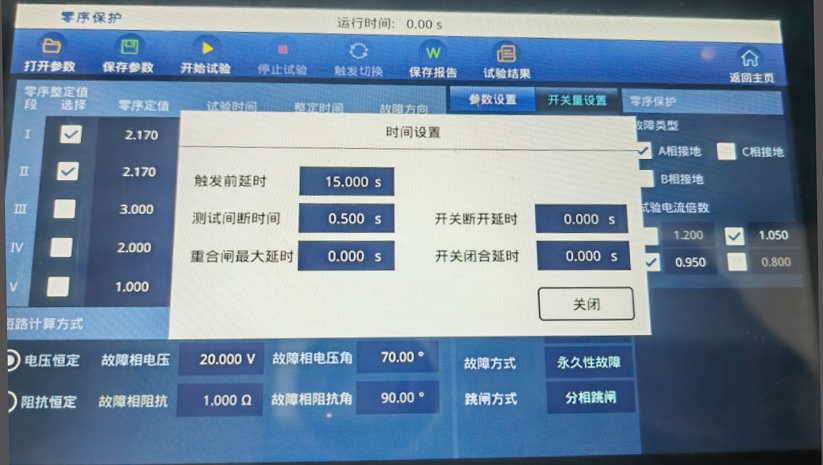 在零序保護(hù)菜單內(nèi),勾選零序Ⅰ、Ⅱ段,分別作為縱聯(lián)零序保護(hù)正方向故障和反方向故障的情況,觸發(fā)方式選擇時(shí)間觸發(fā),觸發(fā)前延時(shí)設(shè)置為15S,保證TV斷線告警消失,選擇分相跳閘方式,試驗(yàn)界面中的相關(guān)定值可根據(jù)定值單設(shè)置,試驗(yàn)時(shí)間一般比定值時(shí)間大0.1-0.2s即可,故障相電壓根據(jù)經(jīng)驗(yàn)值可設(shè)置為20V。