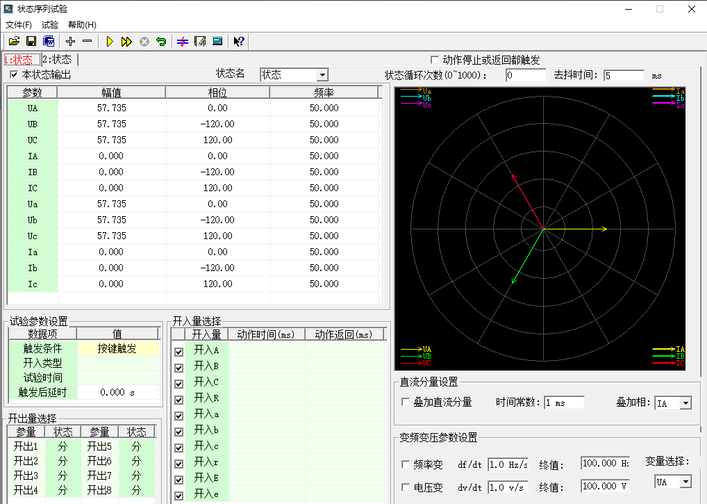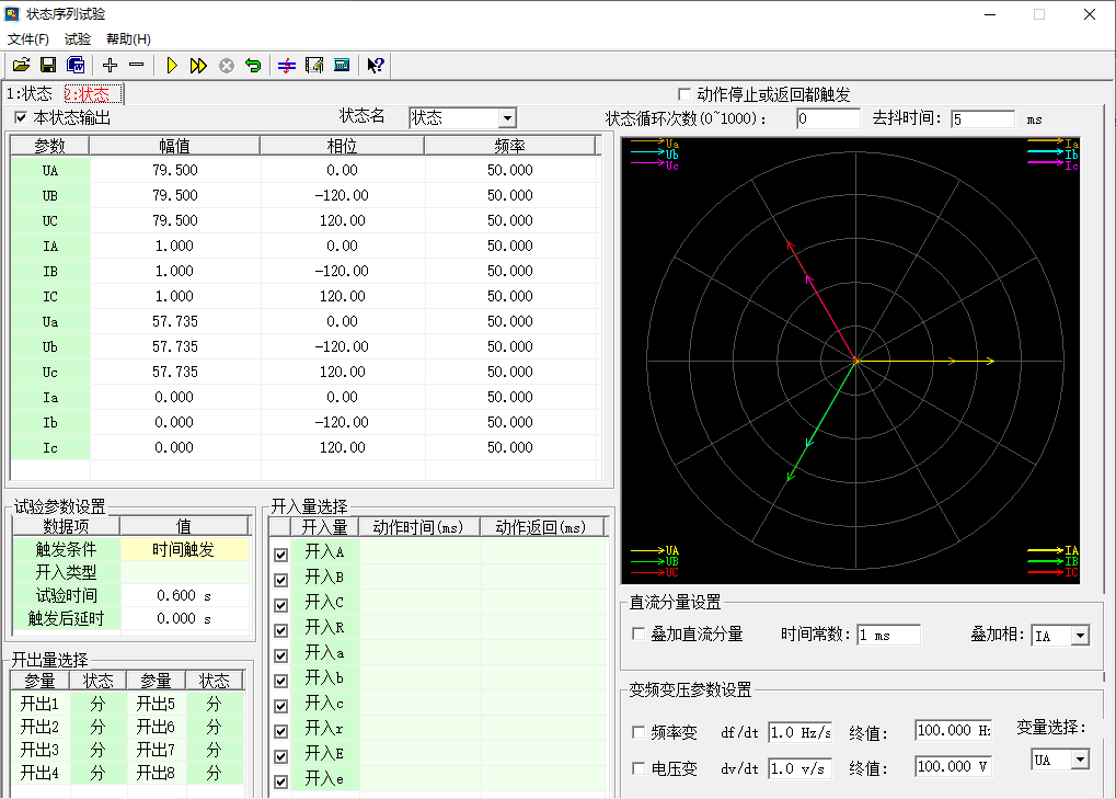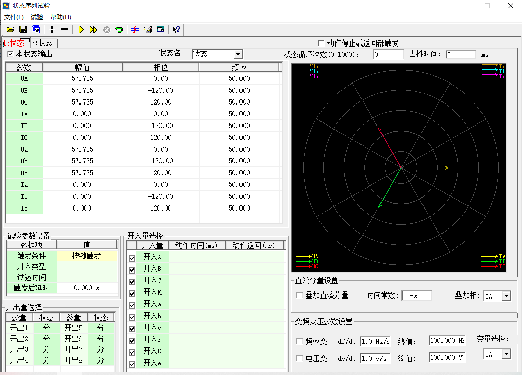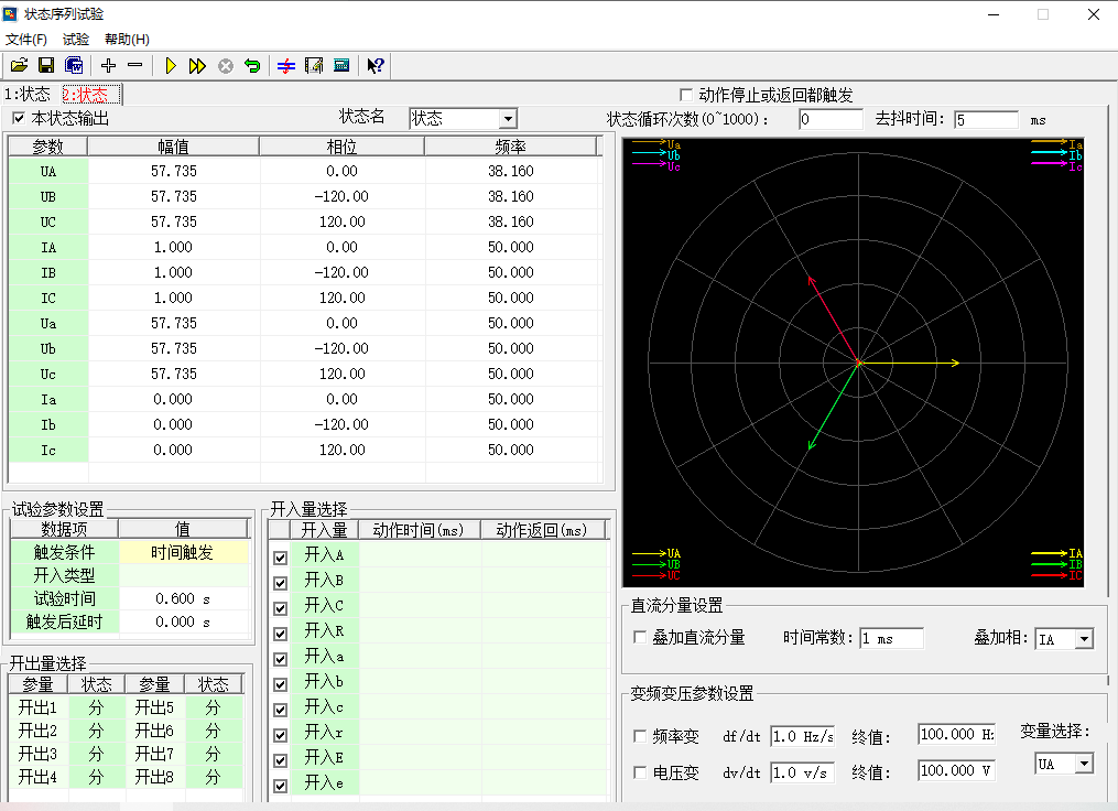 根據(jù)公式計算可知,在額定電壓下滿足過勵磁倍數(shù)的頻率為38.16HZ,狀態(tài)序列設(shè)置如下: