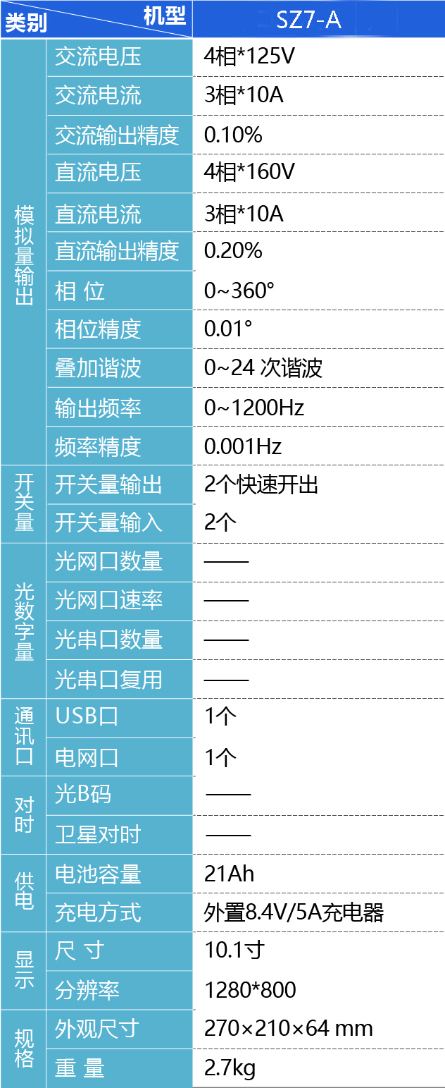 SZ7-A 二次儀表是一款包含4相電壓3相電流高精度輸出的電力二次保護(hù)系統(tǒng)測(cè)試專用儀器儀表。該產(chǎn)品可輸出高精度可控電流與電壓,主要用于變電站二次系統(tǒng)保護(hù)、測(cè)控、合并單元、智能終端等設(shè)備功能性能測(cè)試。該設(shè)備支持北斗、GPS、B碼對(duì)時(shí),多機(jī)同步輸出。
