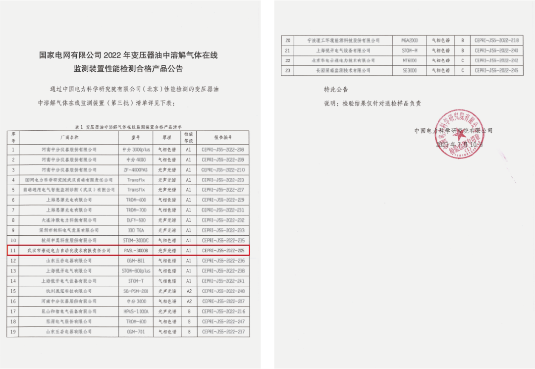 近期,中國電力科學研究院發(fā)布了國家電網(wǎng)有限公司2022年變壓器油中溶解氣體在線監(jiān)測裝置性能檢測合格產(chǎn)品公告, 武漢豪邁 自主研發(fā)的“ PASL-3000 激光光聲光譜變壓器油中氣體在線監(jiān)測系統(tǒng) ”順利通過全性能檢測,達到性能等級A1級,成為國內(nèi)僅有的3家采用激光光聲光譜原理裝置通過A1級檢測的公司之一。